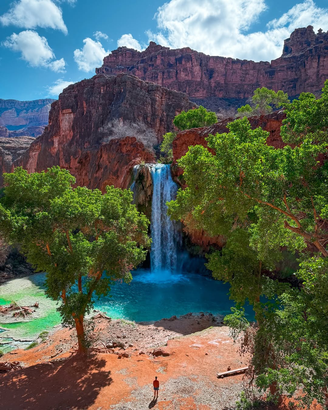 Hidden in the heart of the Havasupai Reservation, Havasu Falls is the kind of place that makes you feel like you’ve discovered a secret oasis. Turquoise waterfalls tumbling over red cliffs into travertine pools—and yes, the water is really that blue.
